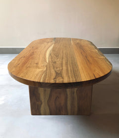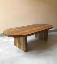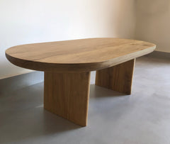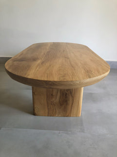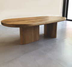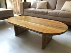Mesa de centro ovalada, con variantes de tipo de madera y diseño de patas. Es una mesa perfecta para aprovechar el espacio, de doble grosor, maciza, pero de forma aligerada y redondeada que la hace muy funcional y cómoda.