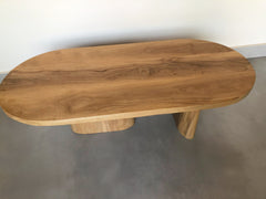 Oval coffee table, with variants of wood type and leg design. It is a perfect table to take advantage of space, double thickness, solid, but with a lightened and rounded shape that makes it very functional and comfortable.