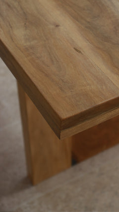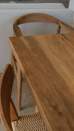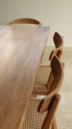 Mesa de diseño simple y elegante, donde lo que se luce es la belleza de la madera. Las patas son macizas lo que resalta aún más la madera y da una sensación de firmeza y peso sin perder elegancia y la delicadeza de los suaves acabados que nuestros carpinteros saben dar a cada pieza.